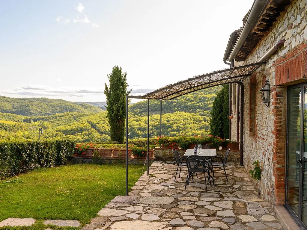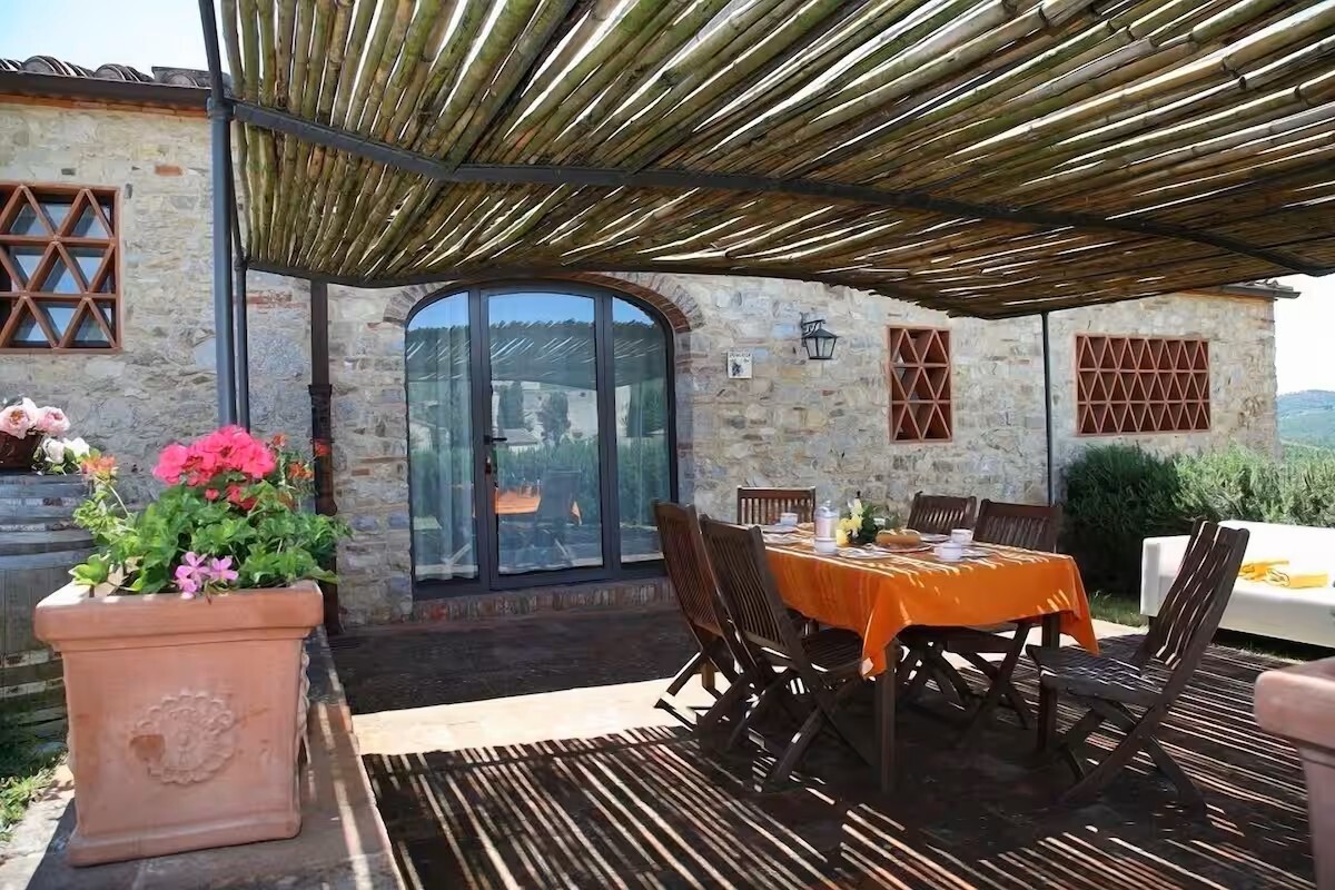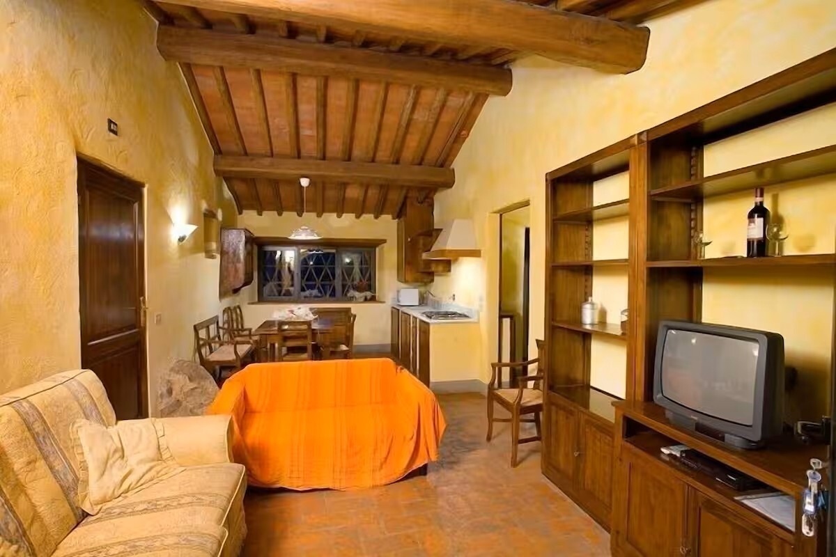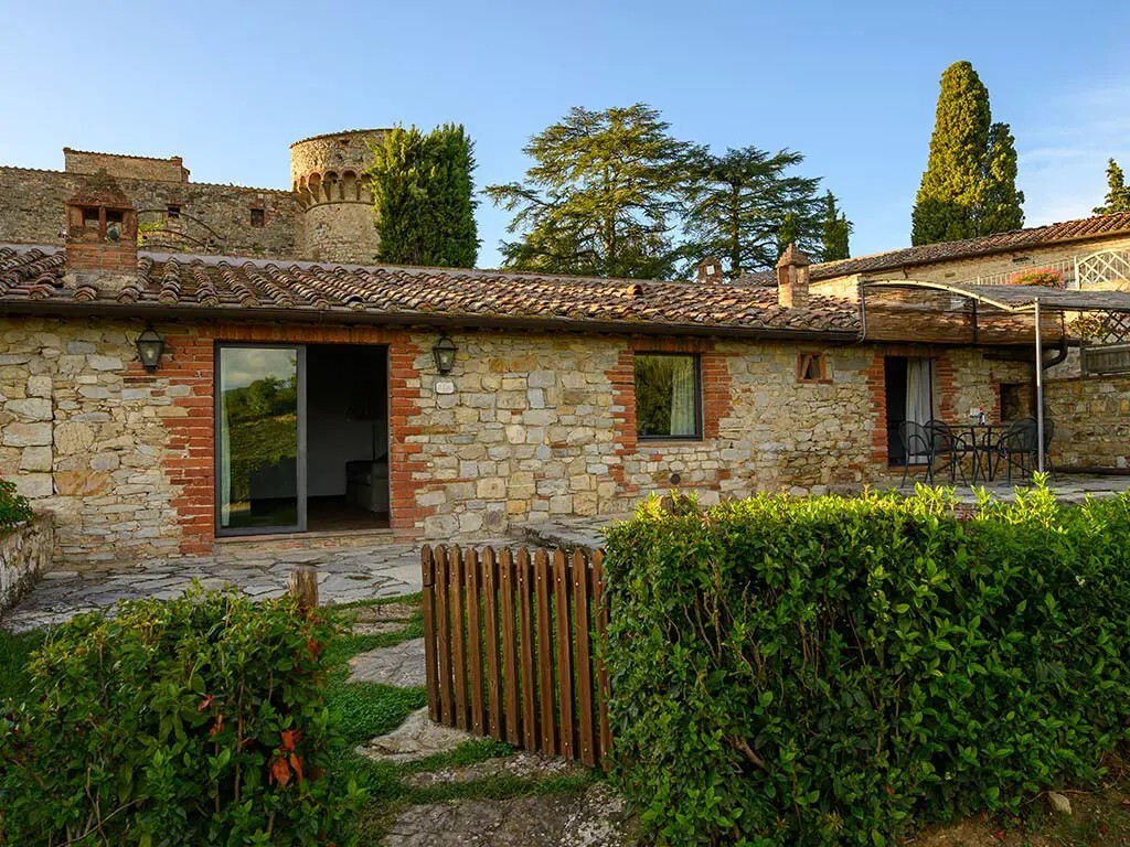 Discover the refined beauty and authentic atmosphere of Villa Massellone, which accommodates up to six people. A gem in the village of Castello di Meleto, this Tuscan villa offers a unique experience with its views over one of Castello di Meleto's vineyards. Just a few steps from the Castle, the Villa offers two double bedrooms, one bedroom with two single beds, and three bathrooms. The entrance leads to a spacious living room characterized by exposed beams and a terracotta floor that evokes the cozy atmosphere of the Tuscan countryside. The kitchen, adjacent to the living room, is equipped with appliances and finished with wooden furniture, perfect for preparing and enjoying delicious meals with local products. An outdoor loggia overlooking Castello di Meleto characterizes this structure, offering the opportunity to dine under the starry sky with local products. Just a few steps from the villa is the pool, surrounded by well-kept gardens. Comfortable loungers invite guests to relax.